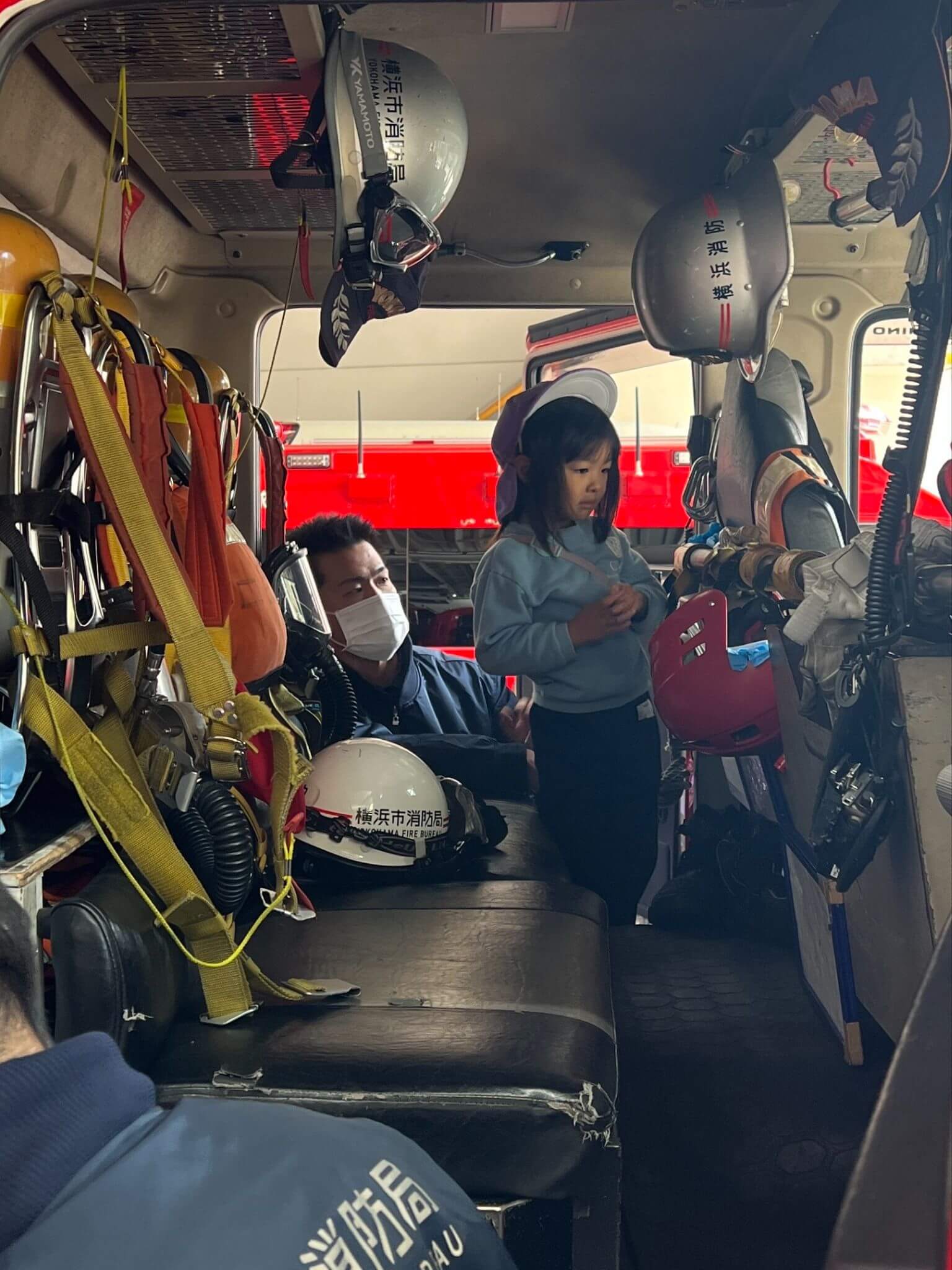 One day on a walk to the city hall, we saw many firefighters in uniform—some in fireproof gear, others in dress uniforms. The children were buzzing with curiosity. It turned out there was a Dezome-shiki (New Year firefighter ceremony) and related event hosted by the Naka Ward Fire Department. We got to see several fire trucks and even try on firefighting gear, which the children loved.