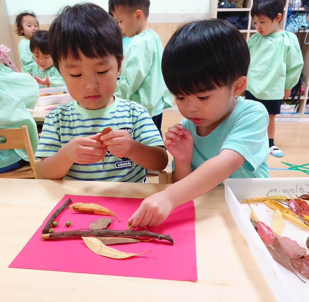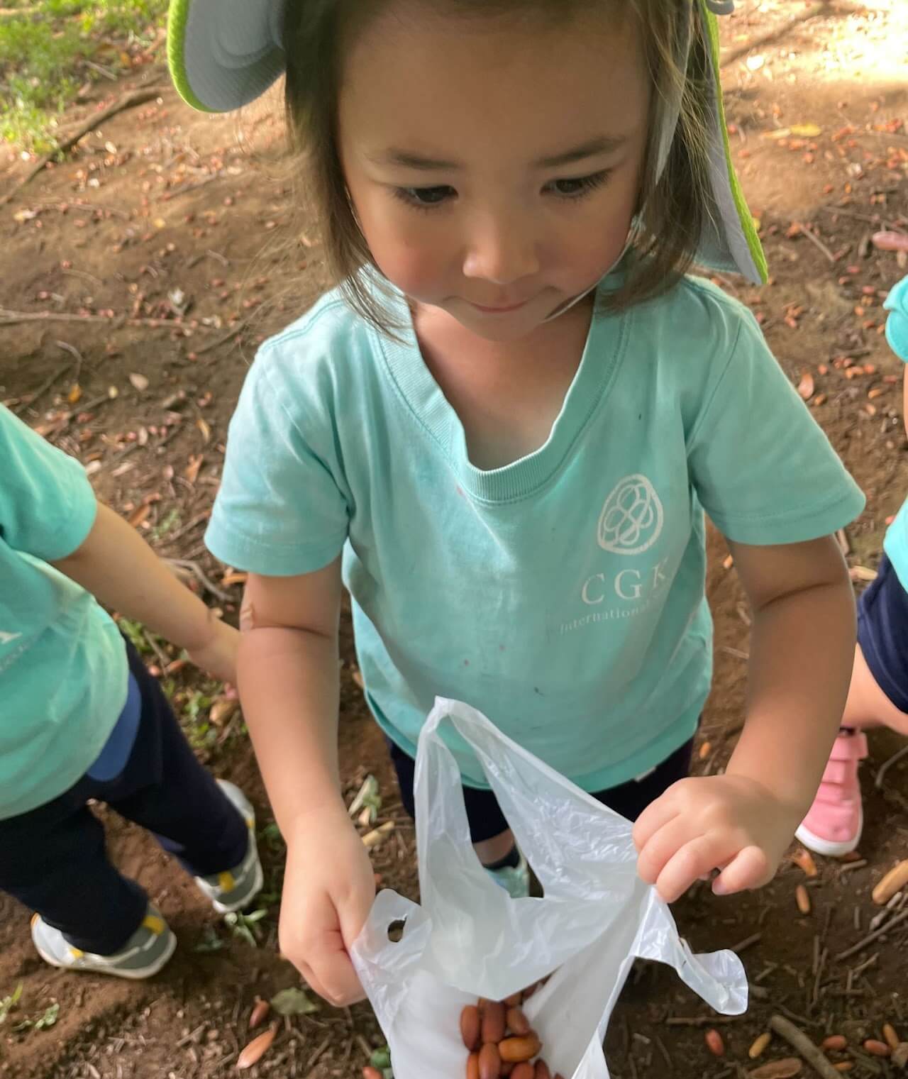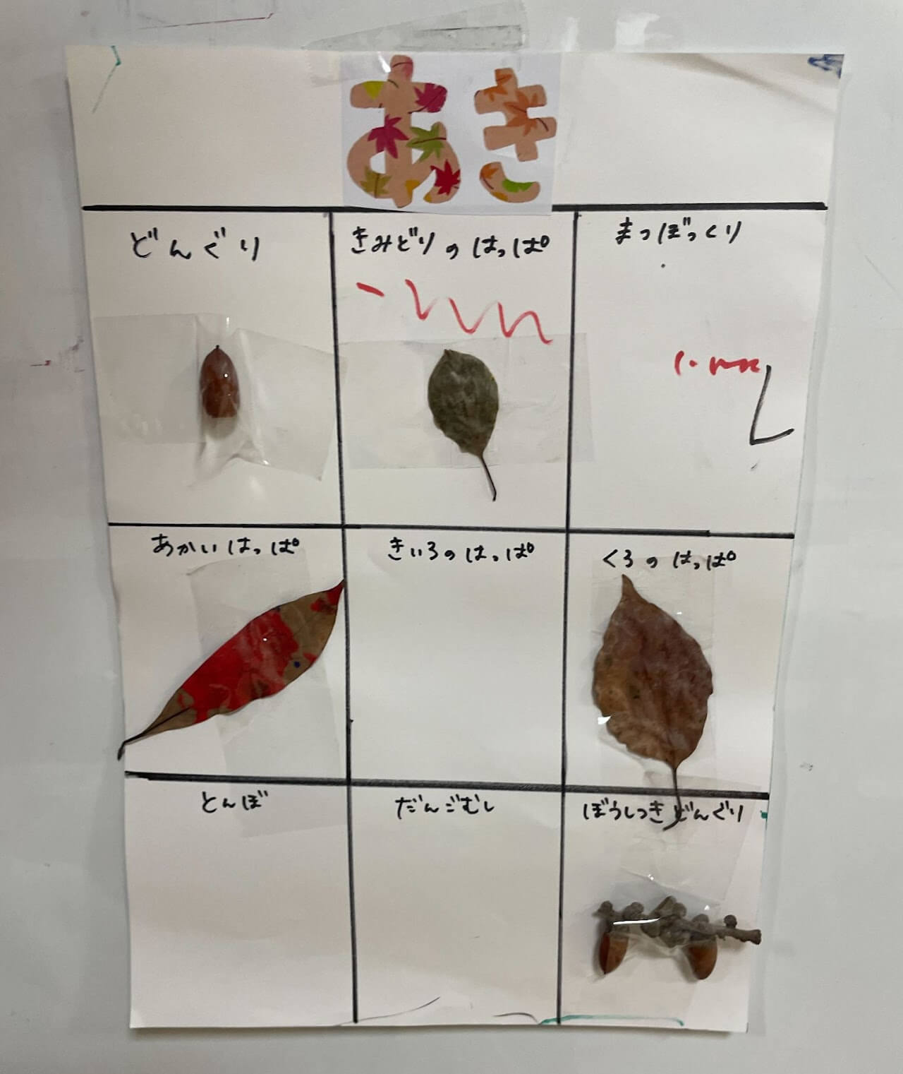 後日、日本語の時間には「どんぐりやまつぼっくり、葉っぱはどこから来たのかな?」「なんである公園とない公園があるんだろう?」とみんなで考え、話し合いました。子どもたちは自分の体験をもとに、さまざまな角度から秋を感じ、考え、楽しんでいました。