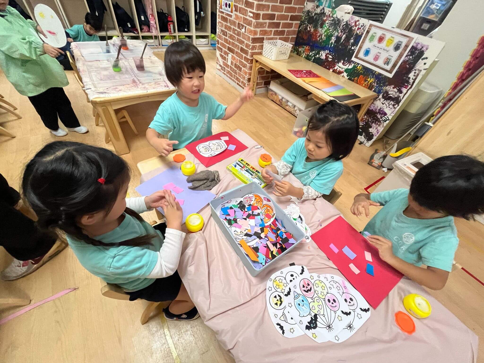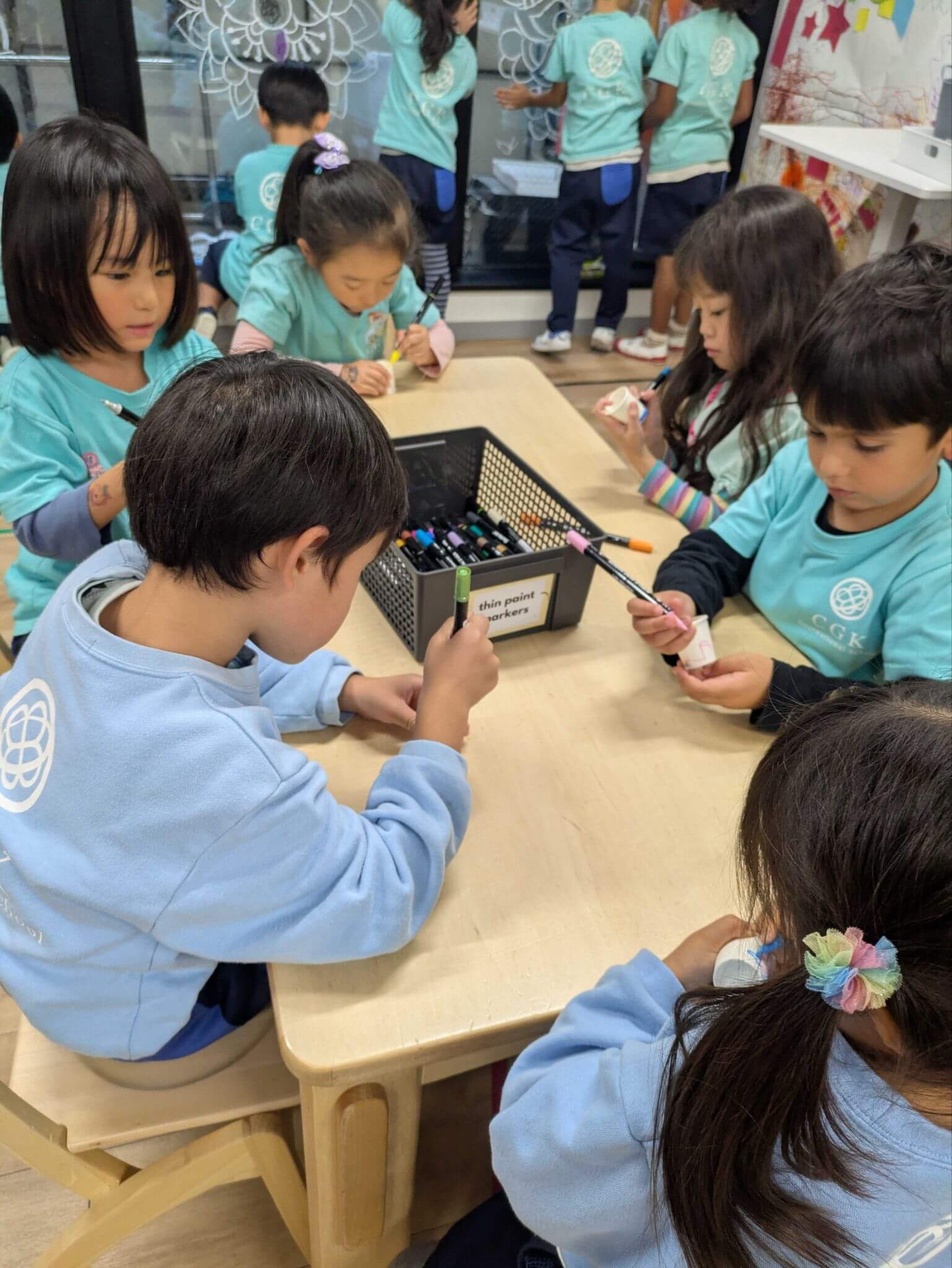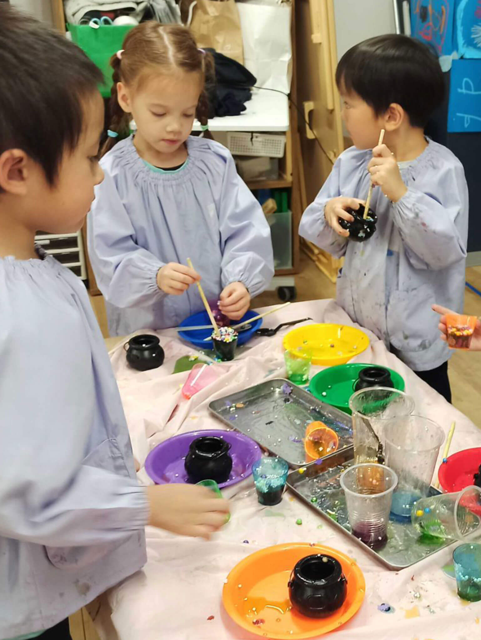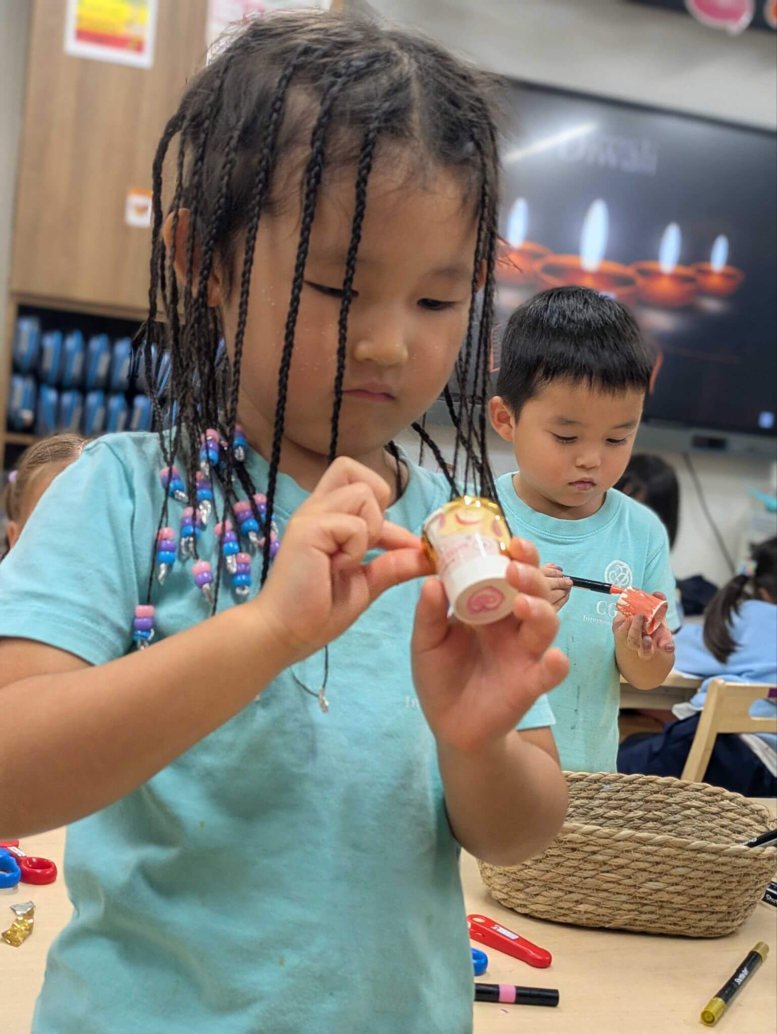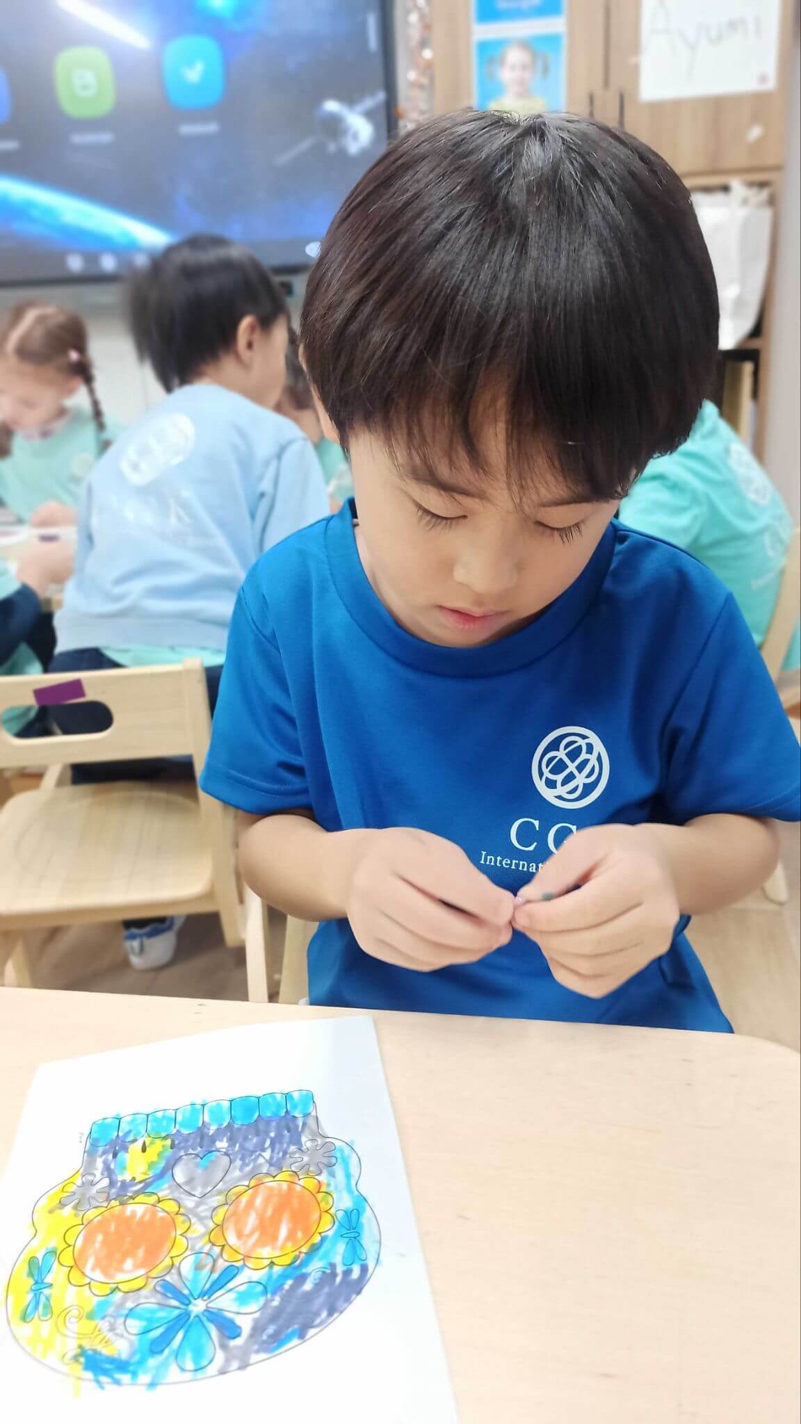 子どもたちは、このような世界のお祝いごとと自分たちの経験を結びつけながら、好奇心いっぱいに学んでいます。特にアート活動では、自分の感じたことや学びを表現することを楽しんでいました。カラフルなランゴリ模様やディヤランタン(灯りの入れ物)を作ったり、泡立つ魔女の薬を描いたり、自分だけのシュガースカルをデザインしたりと、それぞれが創造性を存分に発揮しました。