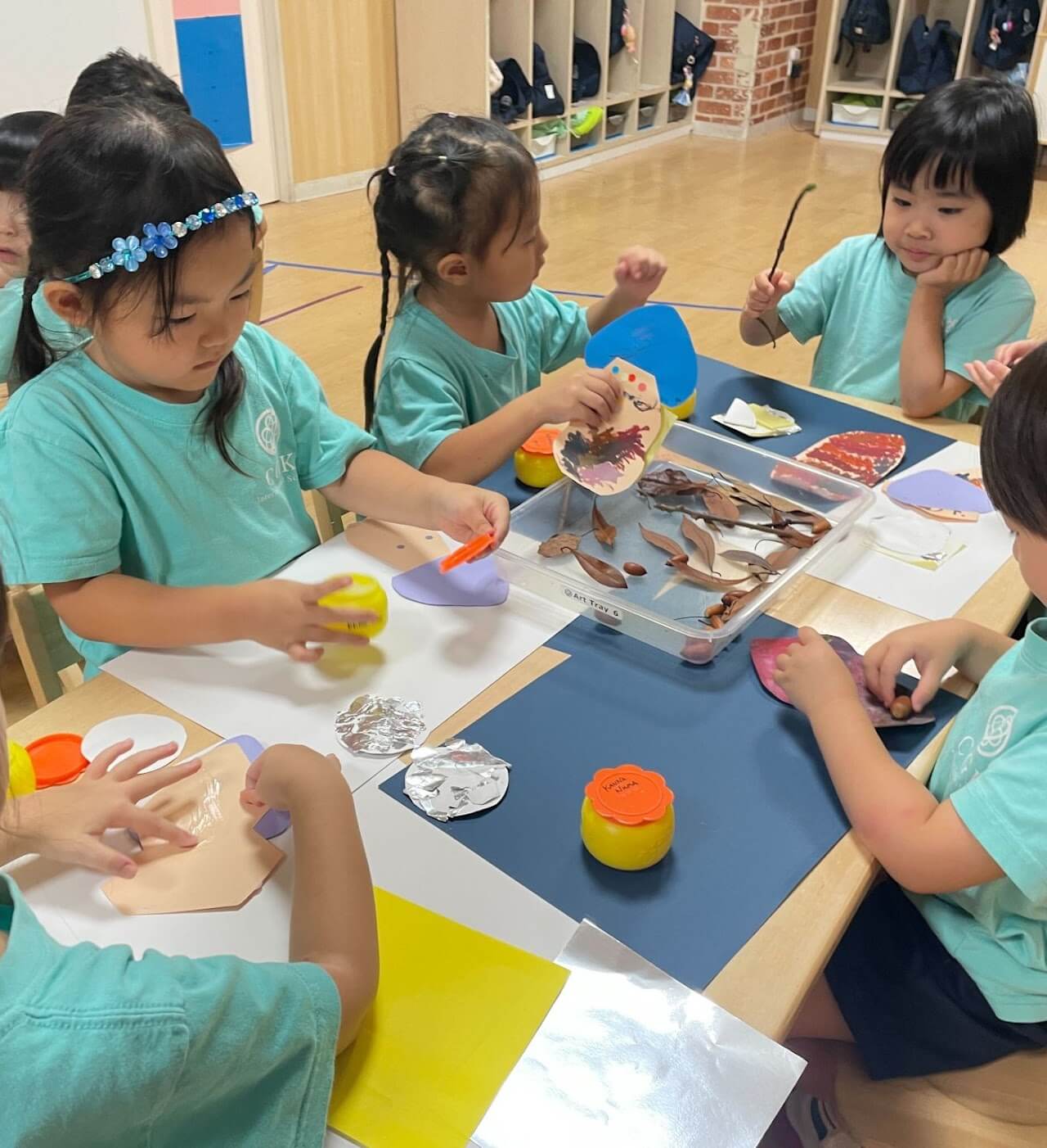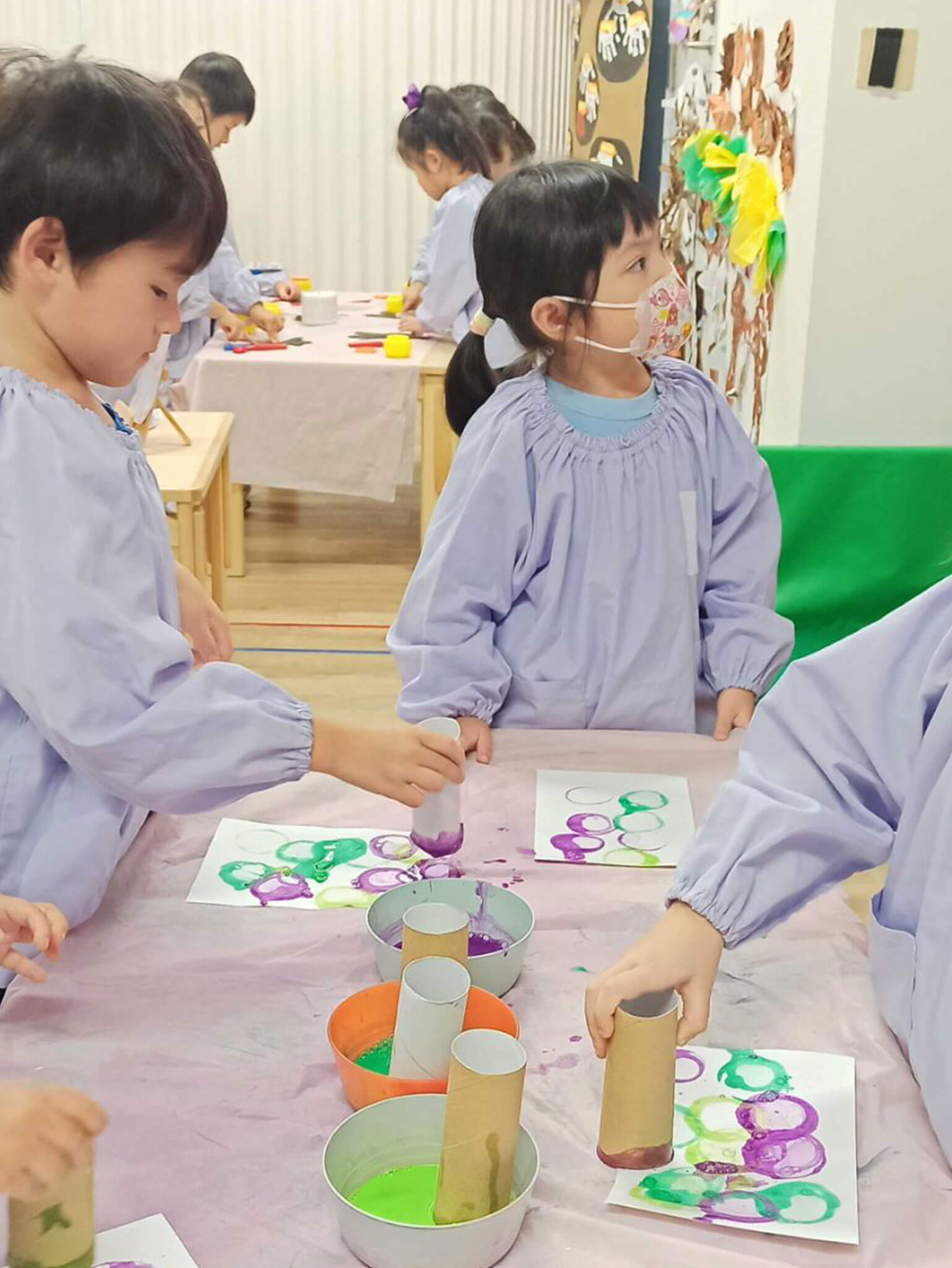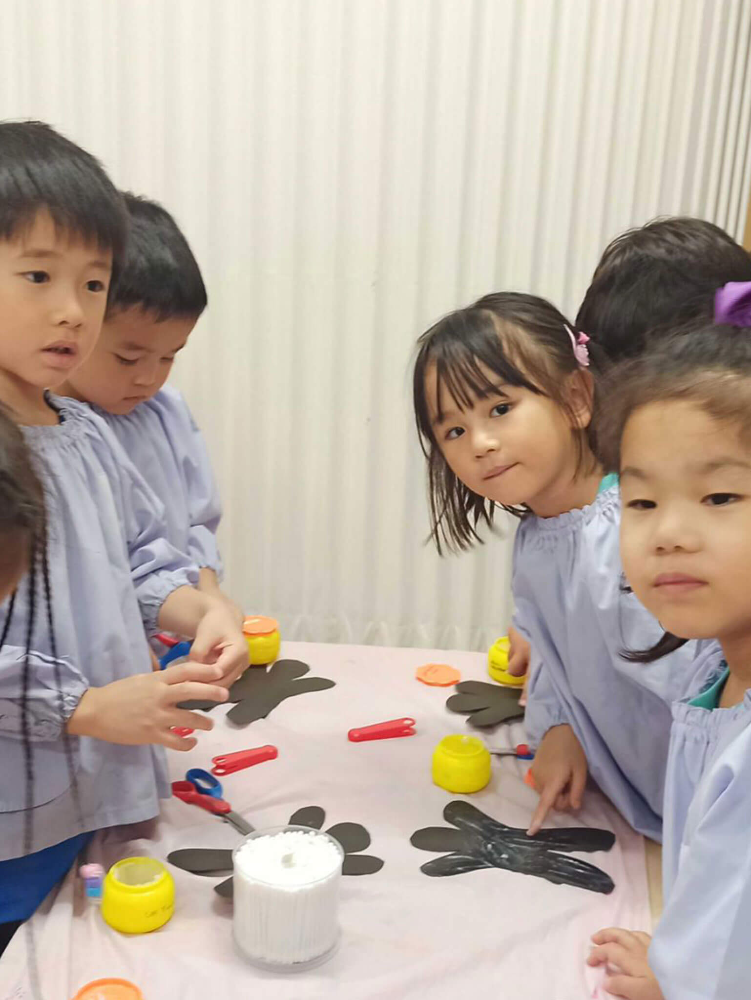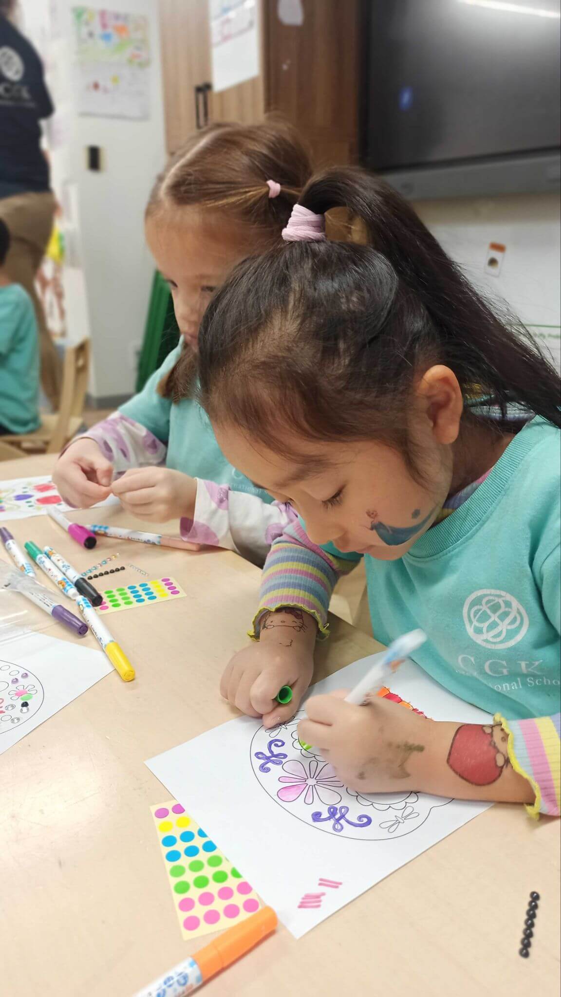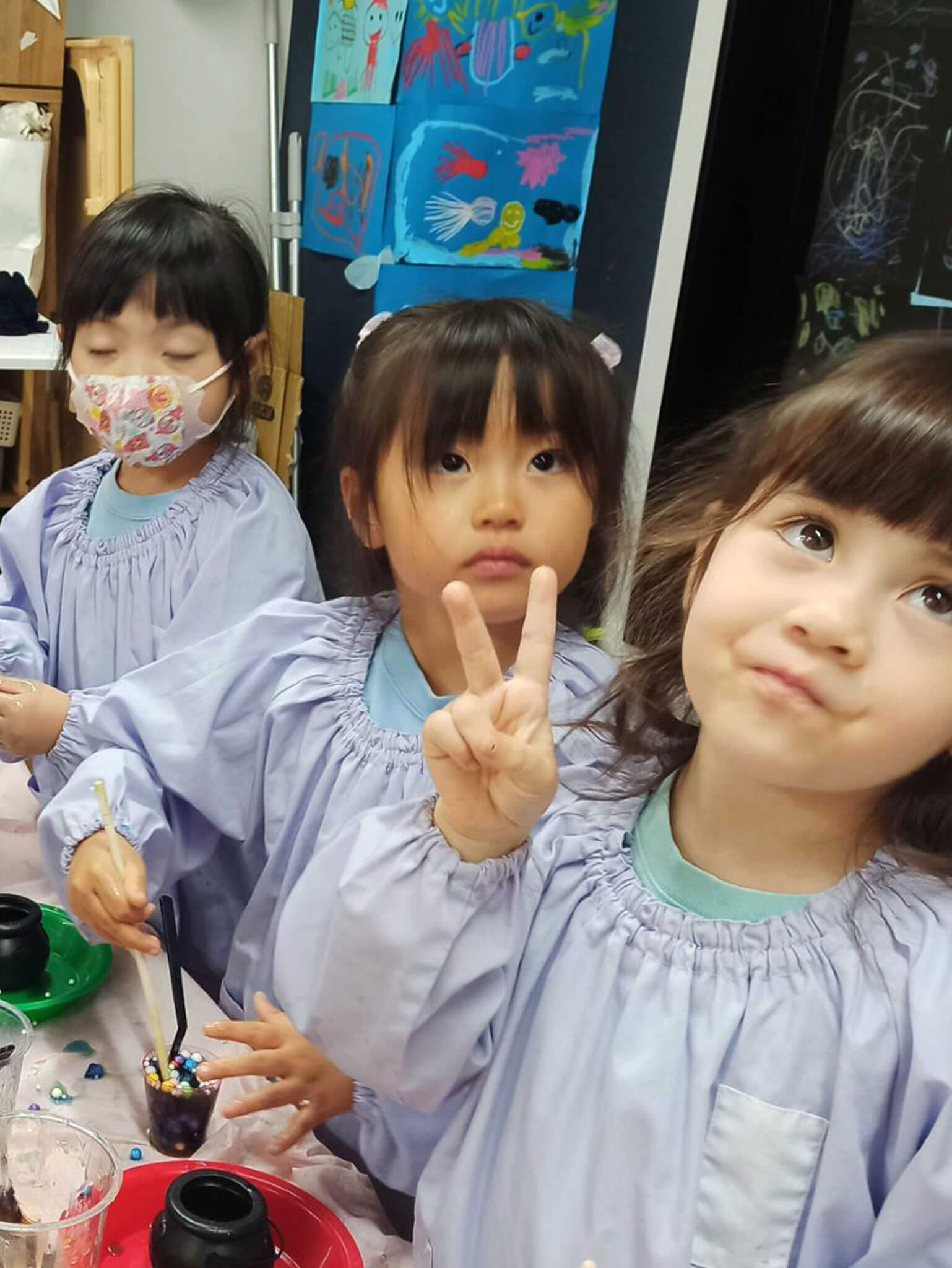 子どもたちは、このような世界のお祝いごとと自分たちの経験を結びつけながら、好奇心いっぱいに学んでいます。特にアート活動では、自分の感じたことや学びを表現することを楽しんでいました。カラフルなランゴリ模様やディヤランタン(灯りの入れ物)を作ったり、泡立つ魔女の薬を描いたり、自分だけのシュガースカルをデザインしたりと、それぞれが創造性を存分に発揮しました。