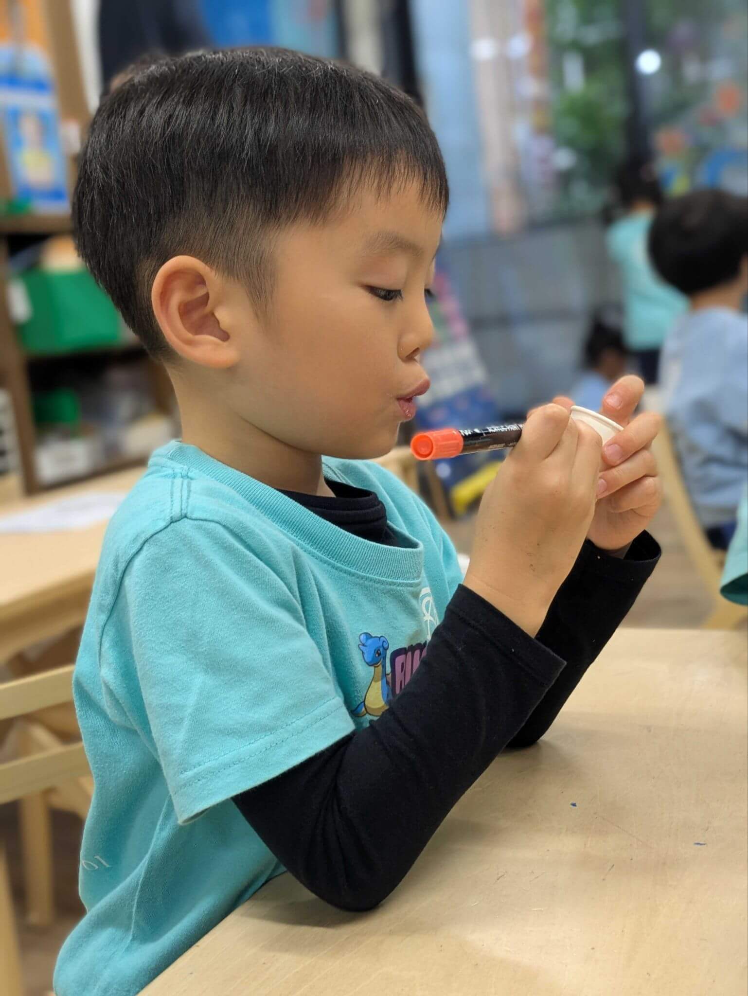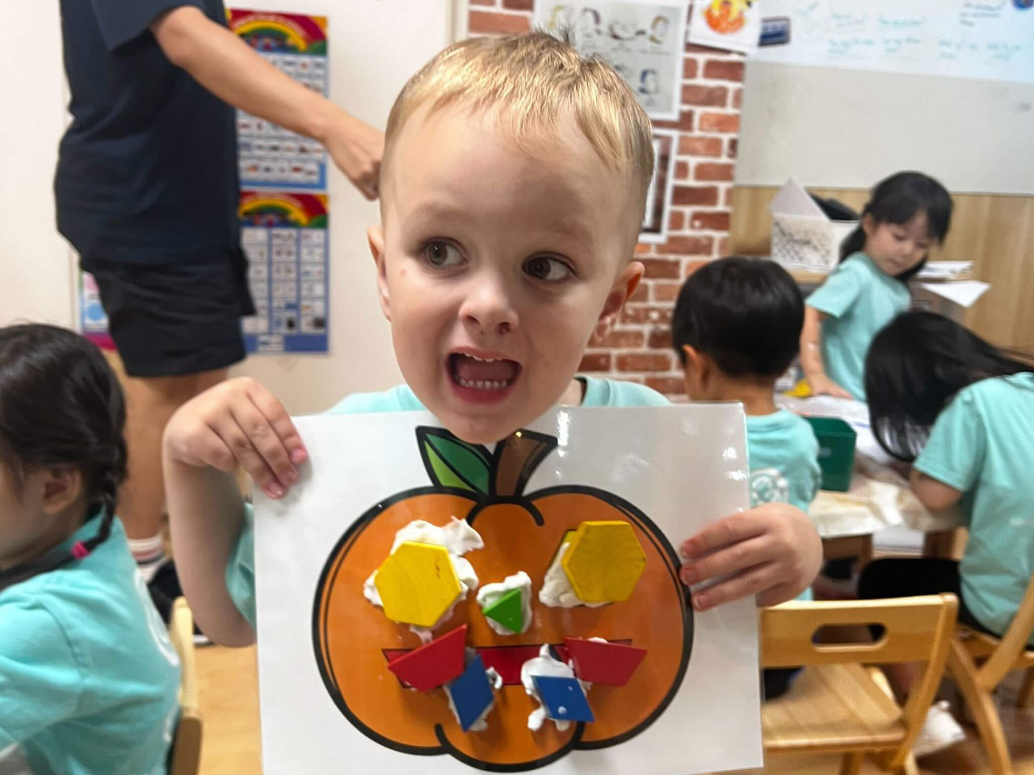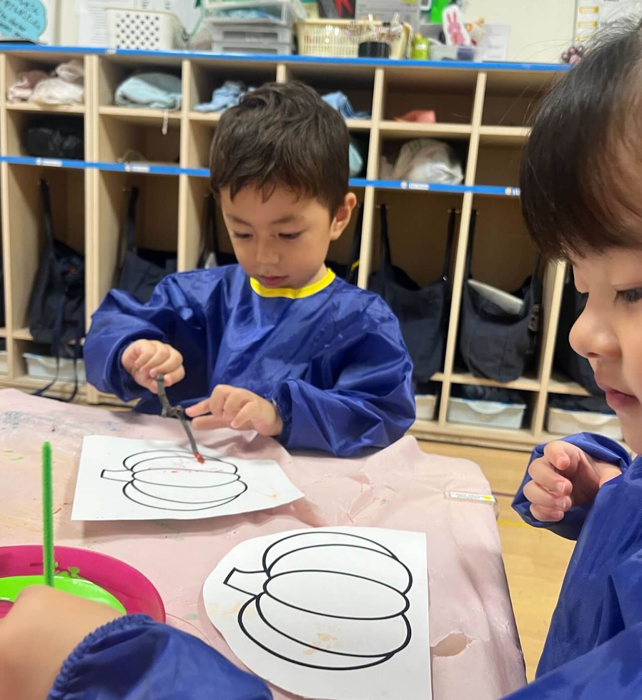 School FestivalやHarvest Festivalに向けては、たくさんの制作に取り組みました。クレヨン、絵の具、はさみ、のり、テープなど、さまざまな素材や技法に挑戦できるステーションを用意し、子どもたちはそれぞれが興味のあることや得意なことを活かして表現を楽しんでいました。最初は好きなステーションばかりを選んでいた子も、お友だちが楽しそうに活動している様子を見て、「やってみたい!」という気持ちが芽生え、苦手意識のあったことにも自分から挑戦する姿が見られました。お家でも、ちょっとした“お手伝いミッション”を一緒に考えてみてください。まだすべてを任せるのは難しくても、「自分でやってみよう」と思える経験が、”自信と責任感(Responsibility)"につながっていくことと思います。