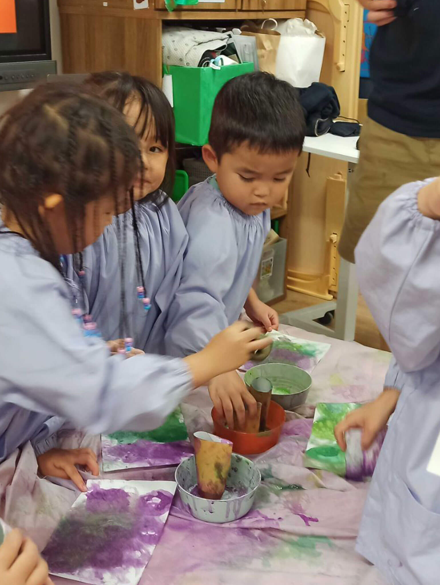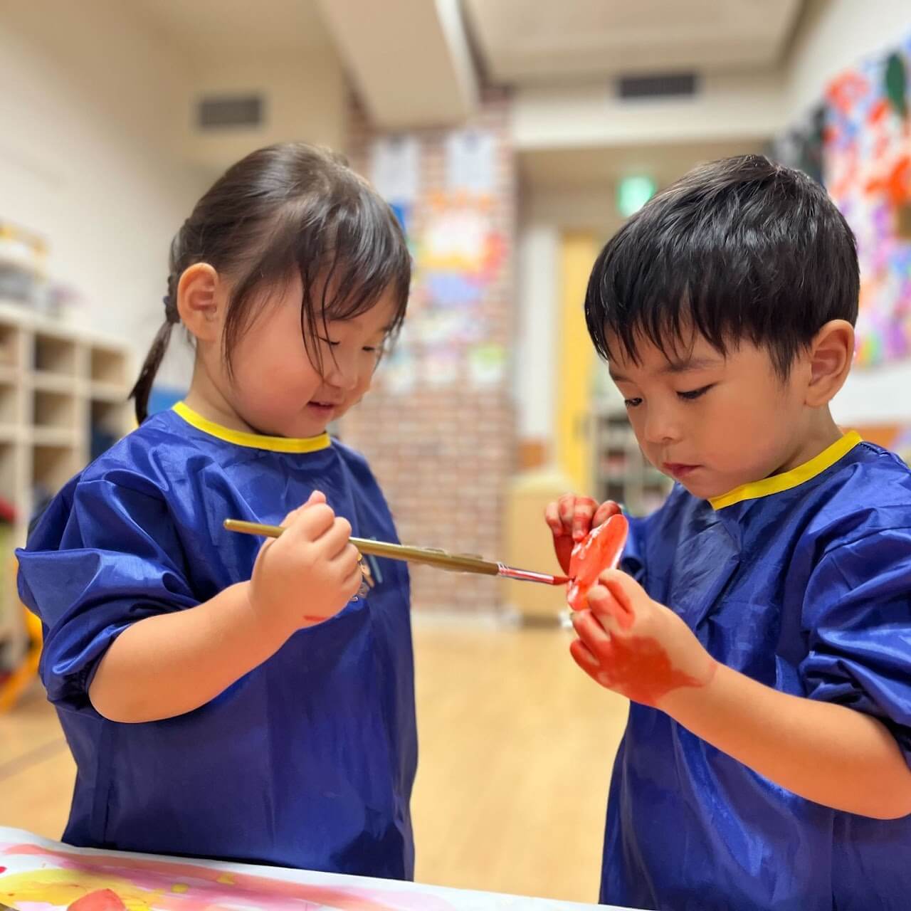 ある日の午後は、筆の代わりに自然の素材を使って絵を描くアート活動を行いました。秋の葉っぱや小枝、どんぐりを道具にして、絵具で模様を描きながら、子どもたちは個性あふれる作品を生み出しました。自然の形状や質感に触れながら、自由な発想で色や形を表現する時間は、子どもたちの感性を伸ばし、創造力をさらに高めるものとなりました。