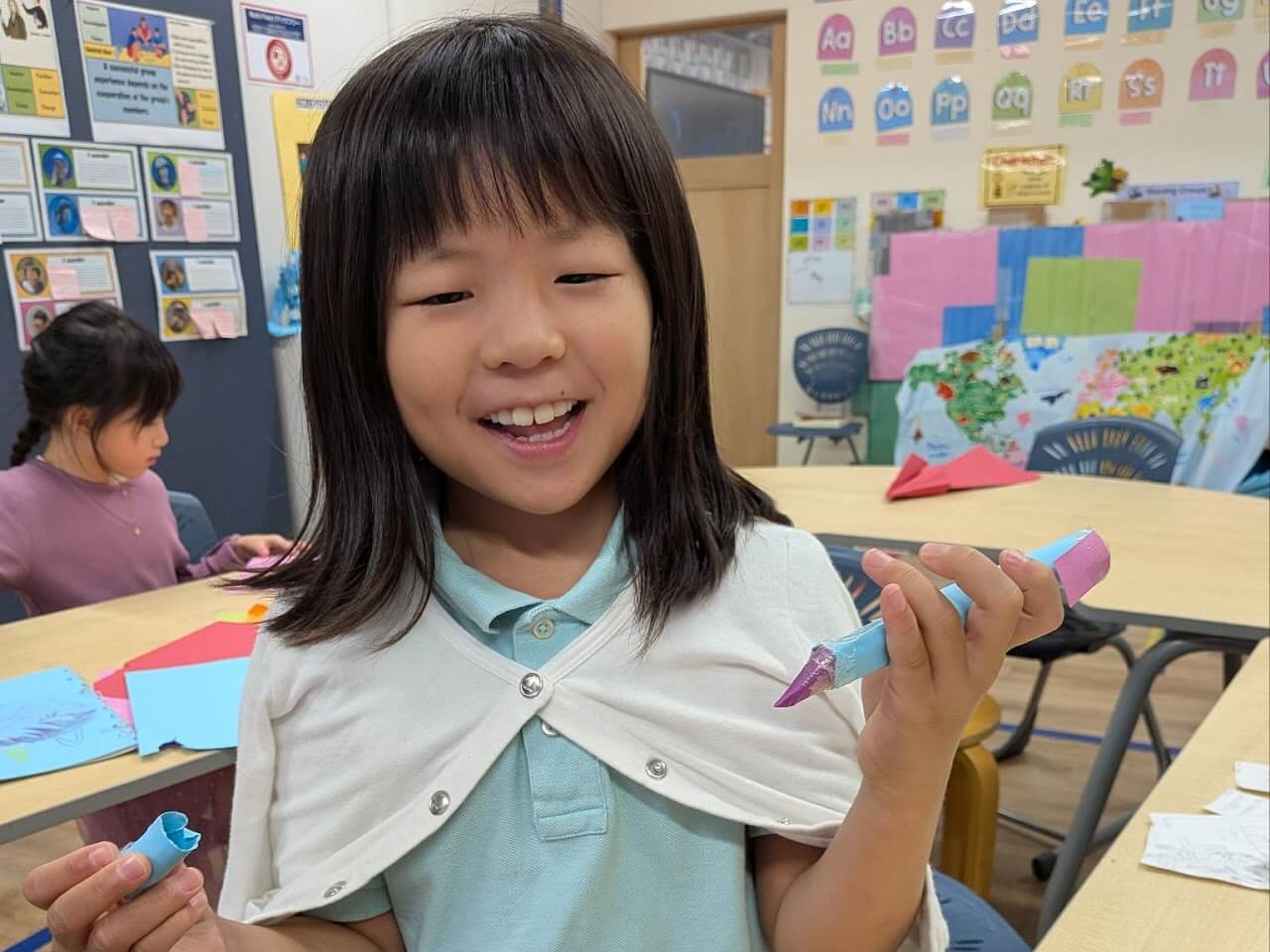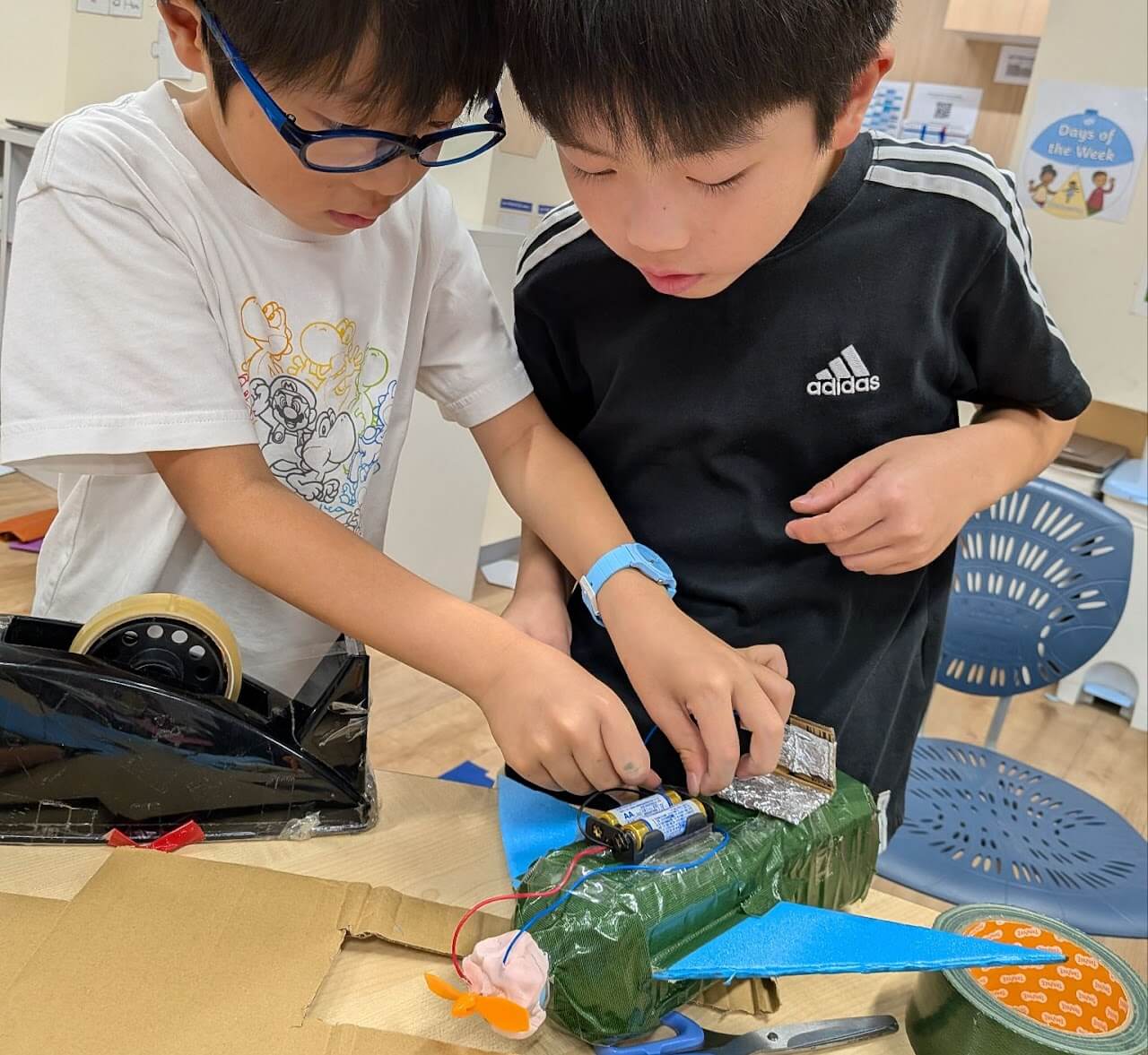 また最近では、お店づくりと理科・工学の学習を組み合わせ、より深い学びへと発展しています。「動く商品」や「光る商品」を作って売りたいという声を受けて、簡単な電気回路やDCモーター(直流モーター)について学びました。電気の流れ方や「閉じた回路」の意味、スイッチで電流をコントロールする仕組みなどを理解したあと、実際にプロペラが回る飛行機モデルを制作。スイッチや本体のデザインも自分たちで考え、完成に向けて挑戦しました。この活動を通して、物理やデザイン、問題解決が実体験としてつながりました。