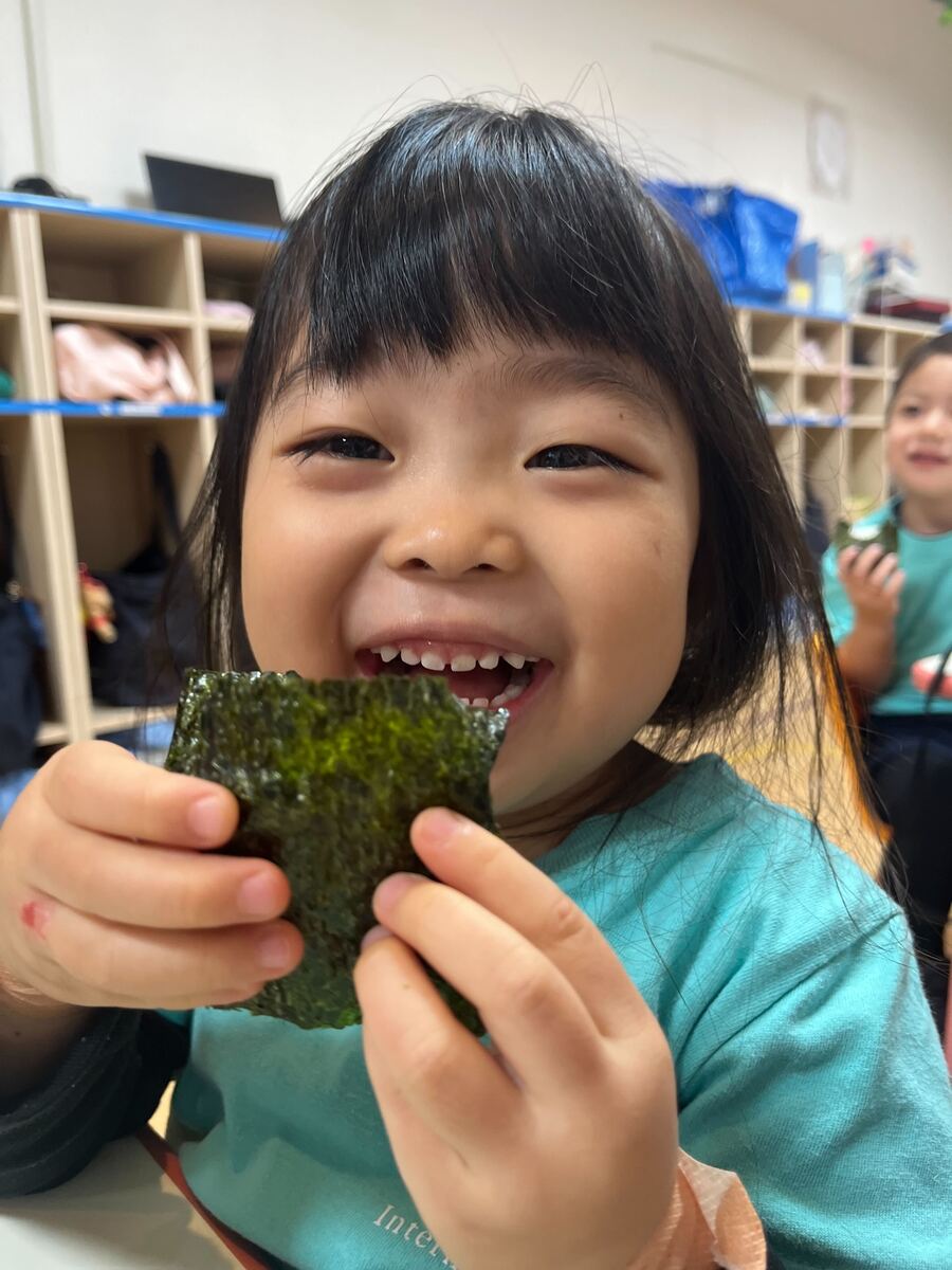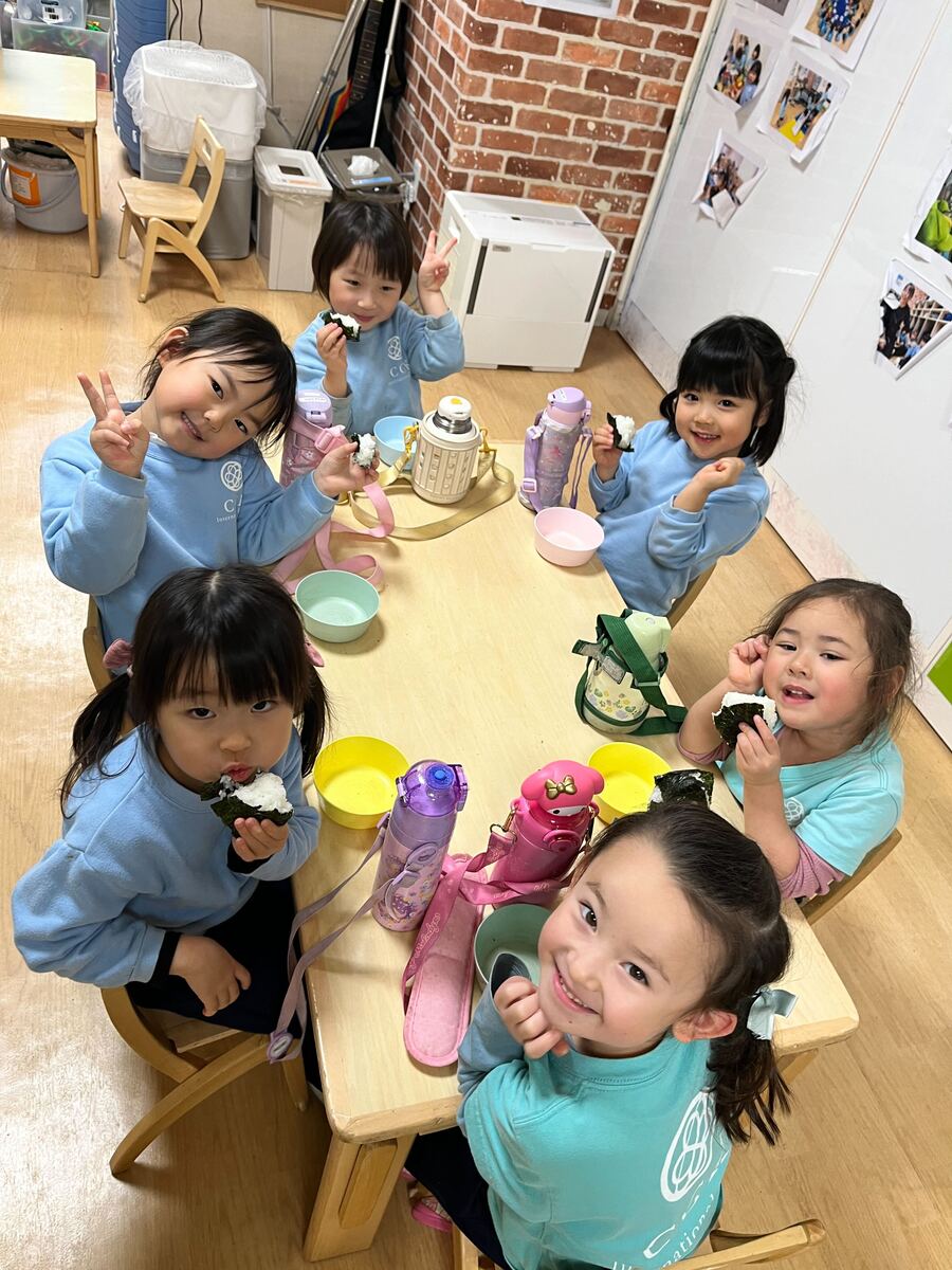 This was our very first time serving onigiri as a snack, and we were excited to see how the children would respond. When they woke up from their naps and saw the onigiri, they exclaimed, “It’s onigiri!” with great excitement. The children were able to decide for themselves whether or not to wrap their rice balls in seaweed, and each child enjoyed eating them in their own preferred way.