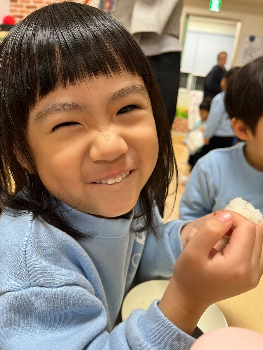 In the 2- and 3-year-old classes, we were a little concerned at first—“Will they be able to eat them neatly?” However, the children carefully adjusted the angle as they ate, making sure not to drop their precious onigiri. Seeing everyone happily enjoying their snack, along with the wonderful aroma of fresh seaweed, even made the teachers say, “We want some too!” with a smile.